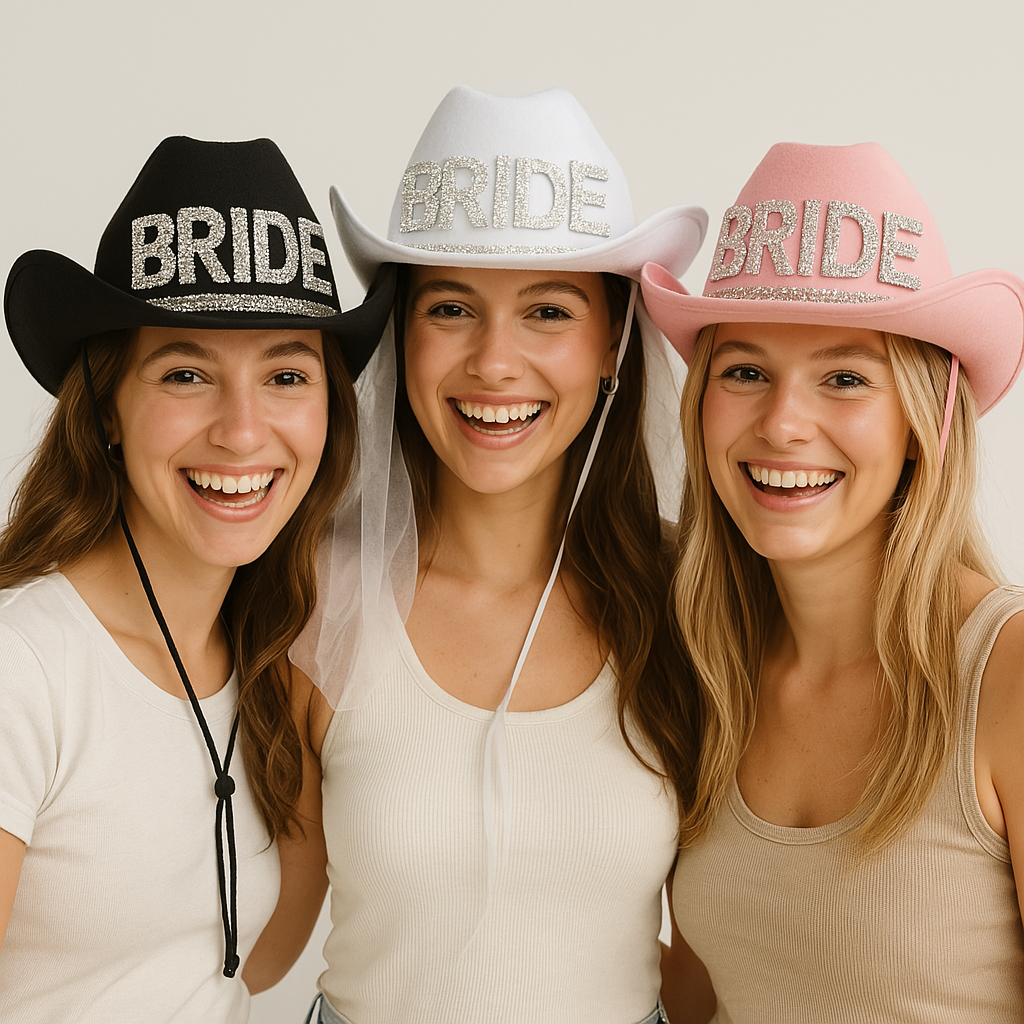 Léger et confortable, il se distingue par son voile raffiné et ses ornements en perles et strass, parfaits pour une touche glamour. Idéal pour un look cowgirl chic, ce chapeau western accompagne les mariées audacieuses, EVJF, ou fêtes à thème.