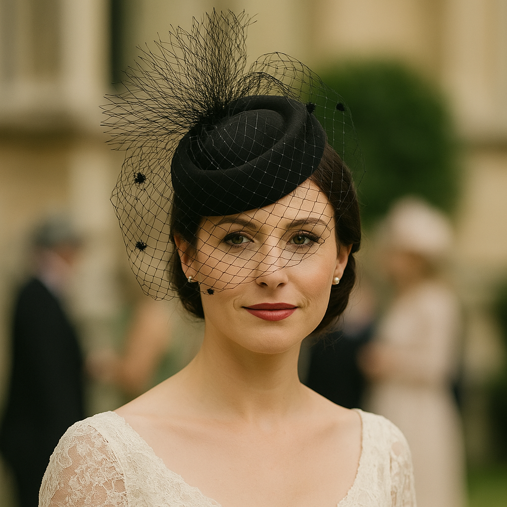 Son design rétro, sublimé par un voile en résille délicat, évoque une élégance intemporelle. Léger et confortable, il se porte facilement en toute saison et s’accorde avec une tenue de cérémonie ou un look chic et original.