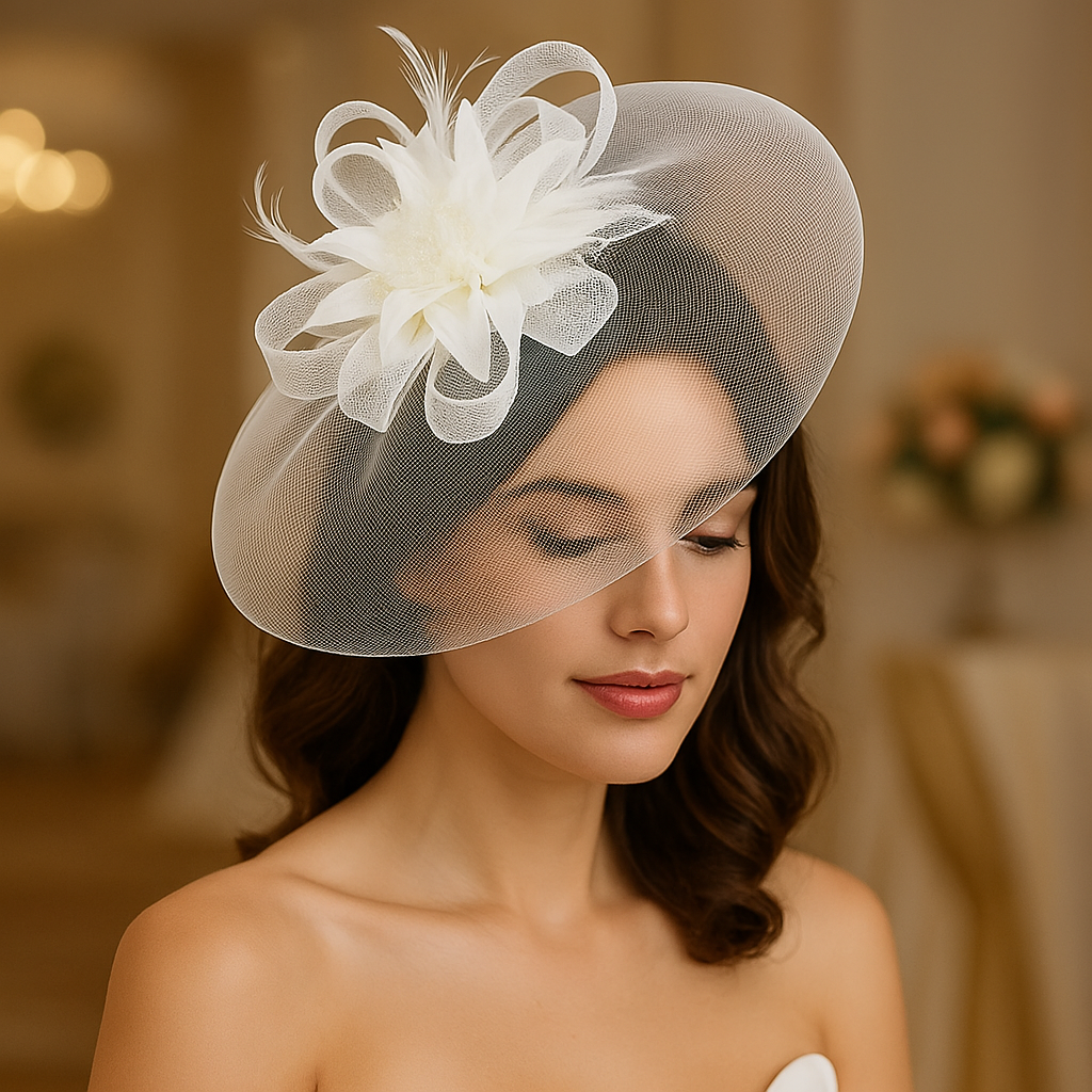Perle Rare, ce fascinator au design floral délicat et orné d’un filet raffiné complète vos tenues de cérémonie d’une touche de grâce intemporelle.