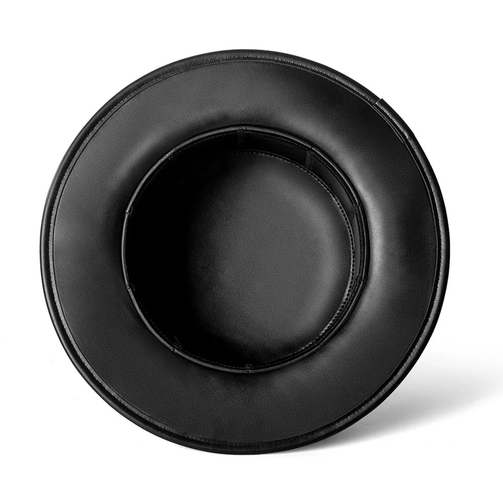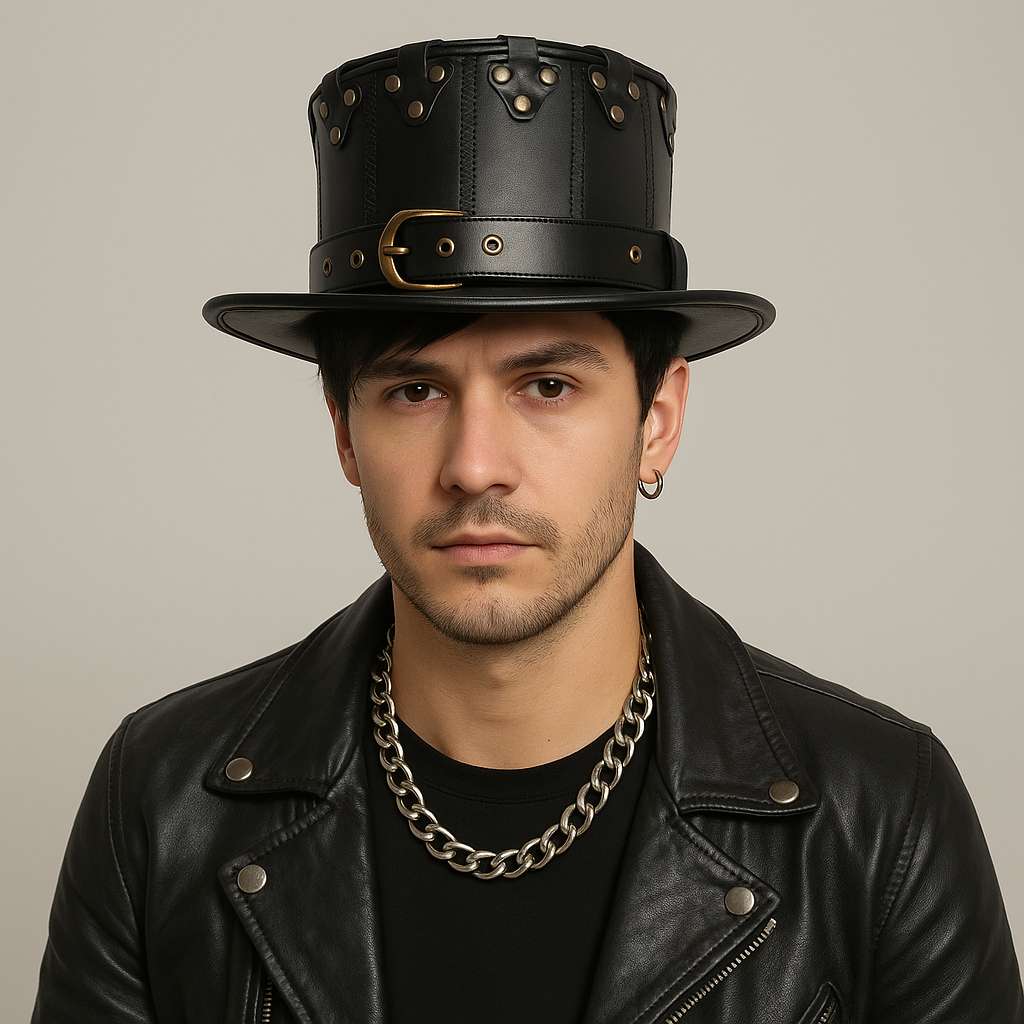 Évoquant l’univers steampunk avec ses finitions rivetées et sa boucle dorée, ce haut de forme revisité offre une silhouette audacieuse et moderne.